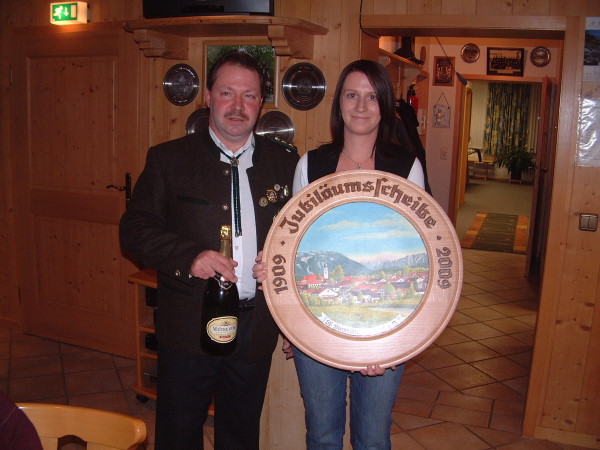 | Die Gewinnerin der Jubiläumsscheibe Kathrin Auer und 1. Schützenmeister Bernhard Lechner |