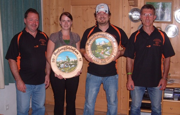 ![]() 1. Schützenmeister Bernhard Lechner, die Gewinnerin der Anfangsscheibe Kathrin Auer, der Gewinner der Geburtstagsscheibe Michael Lausecker und der Scheibenspender Anton Neuer |