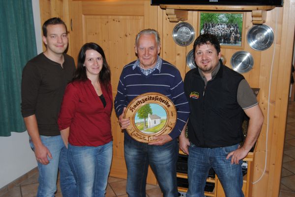 Josef Gröbner hatte mit einem 19.6 Teiler das beste Blattl des Schiessabends. Bei der Siegerehrung überreichte im das Neuvermählte Paar die schön bemalte Hochzeitsscheibe.